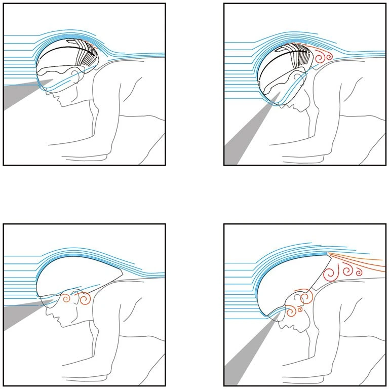 Drawn-out helmet shapes are designed to achieve very strong aerodynamic performance in a predetermined position (ideal line).